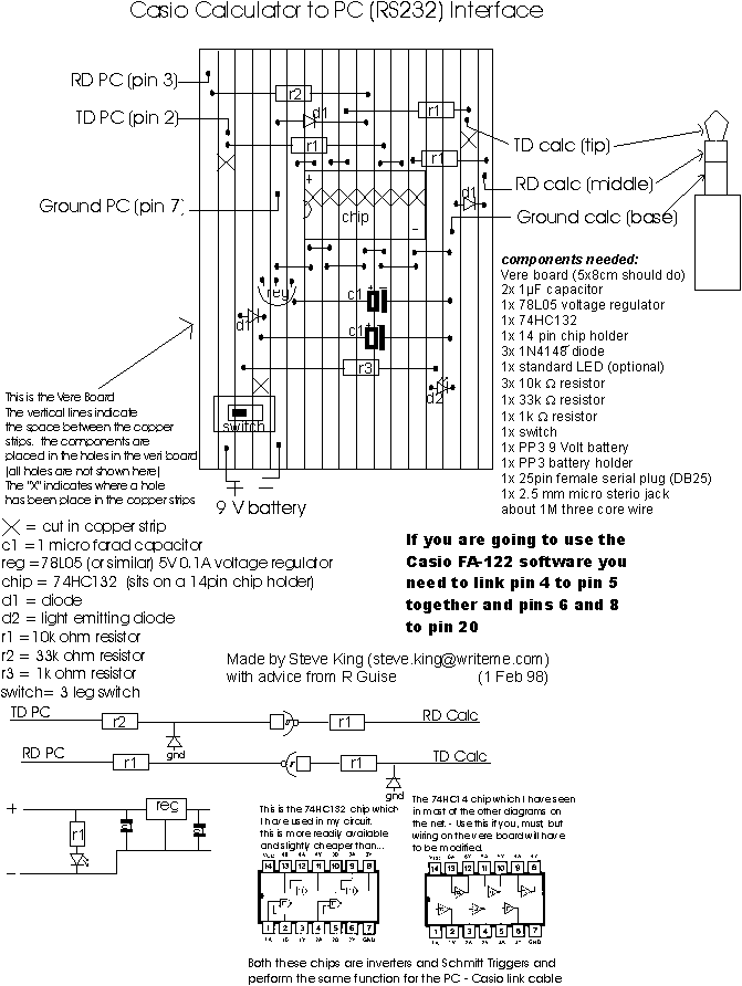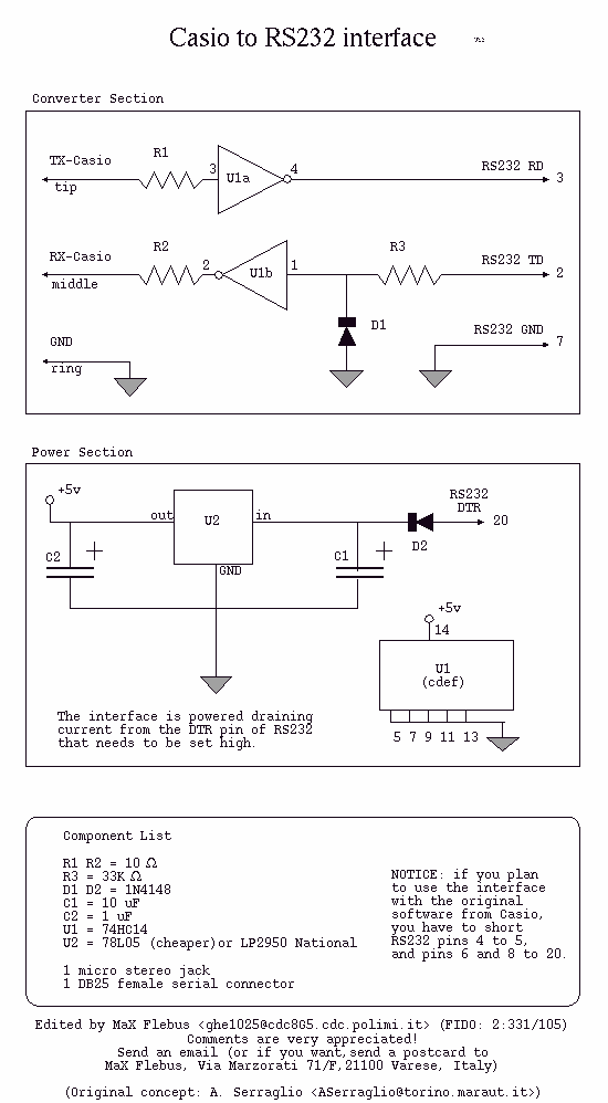 This PC-link cable was available from CASIO, but there are also third-party versions around on the net. The schematics for the link cable can be found on the net as well. I’ve cached two versions (version 1 and version 2) that are technically practically identical.